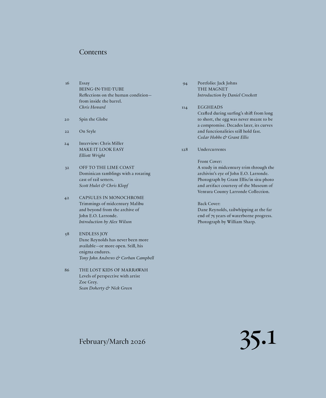 The Surfer’s Journal Issue 35.1 continues the publication’s deep dive into surf culture, craft and character. This edition moves from Lorronde’s photo archives of California waterfront life in the 1930s to present-day Ventura with Dane Reynolds and his circle, tracing the evolution of style and attitude across generations.